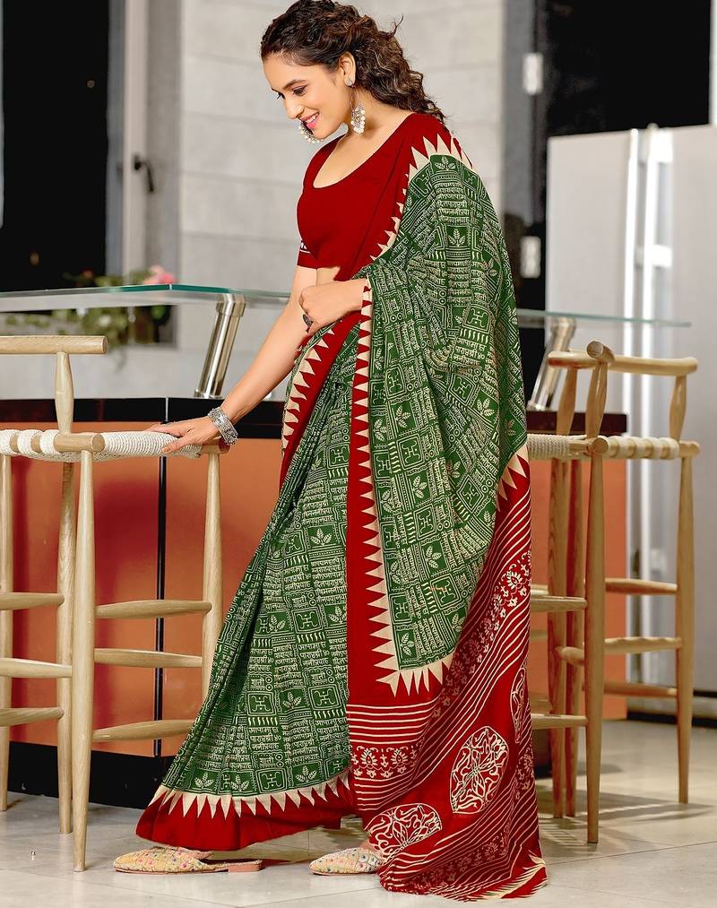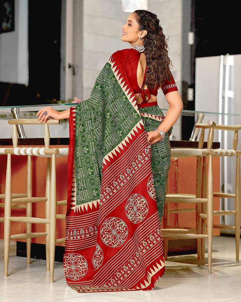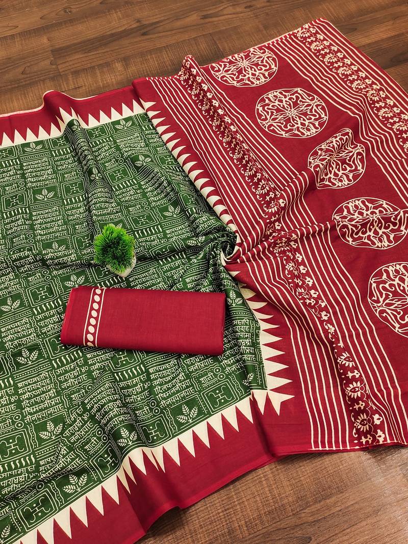 Green block print mulmul cotton saree with blouse.