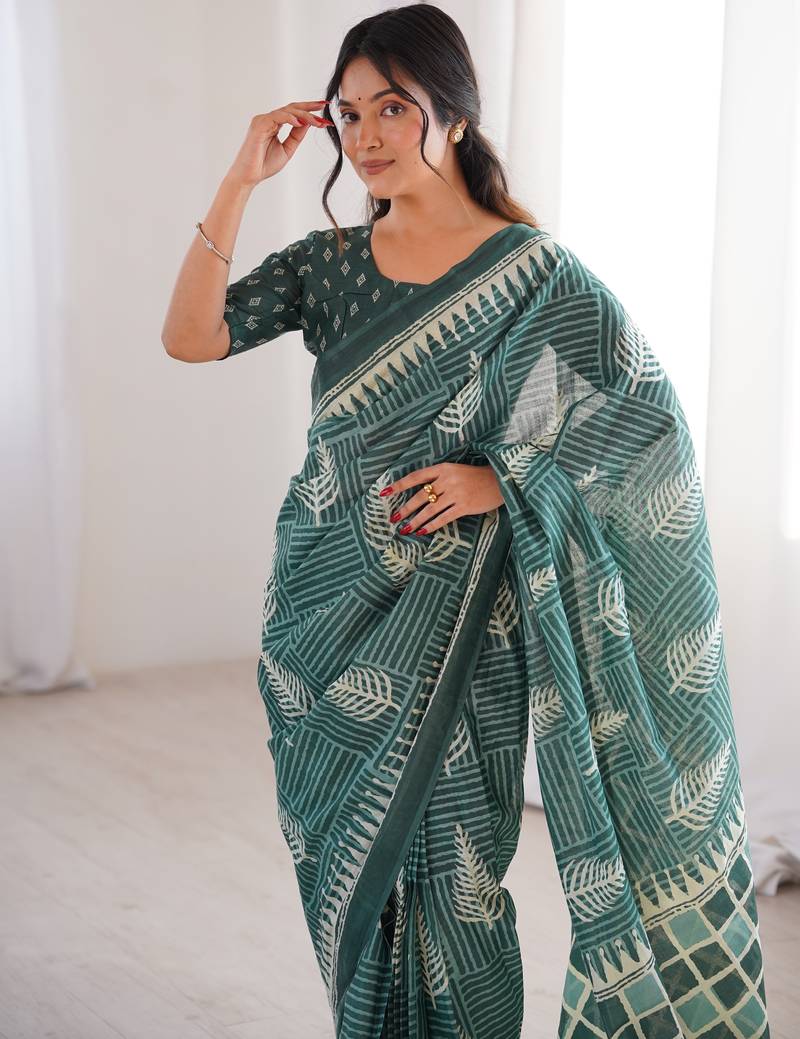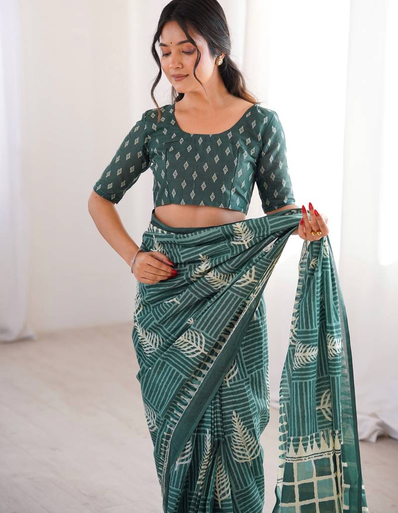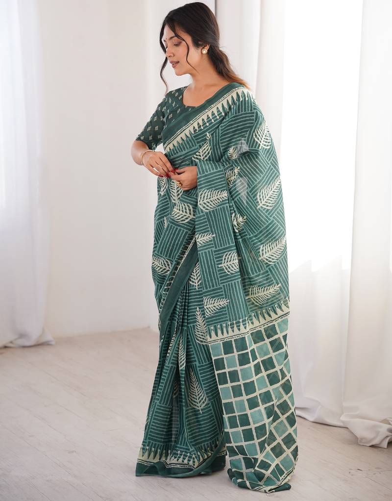 Green blocked printed, floral print, geometric print soft pure cotton saree with blouse.