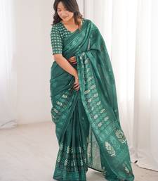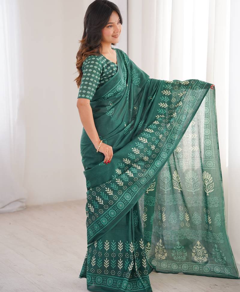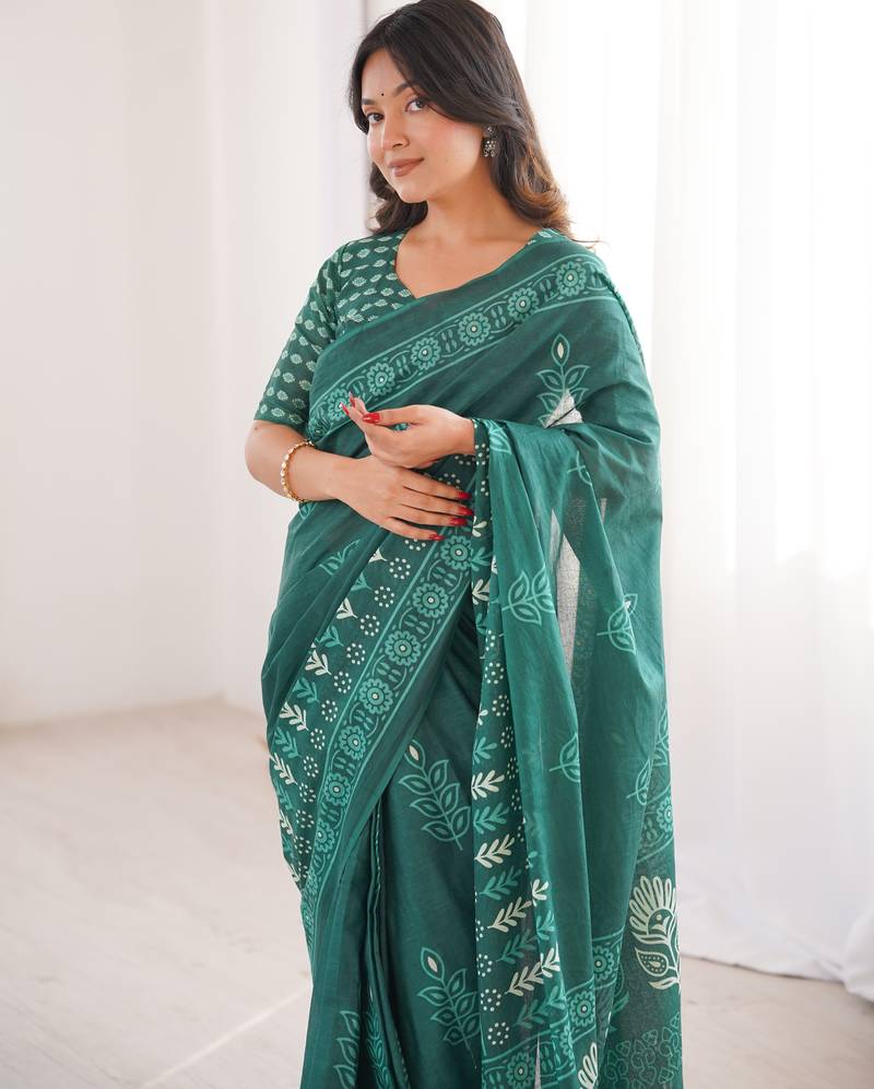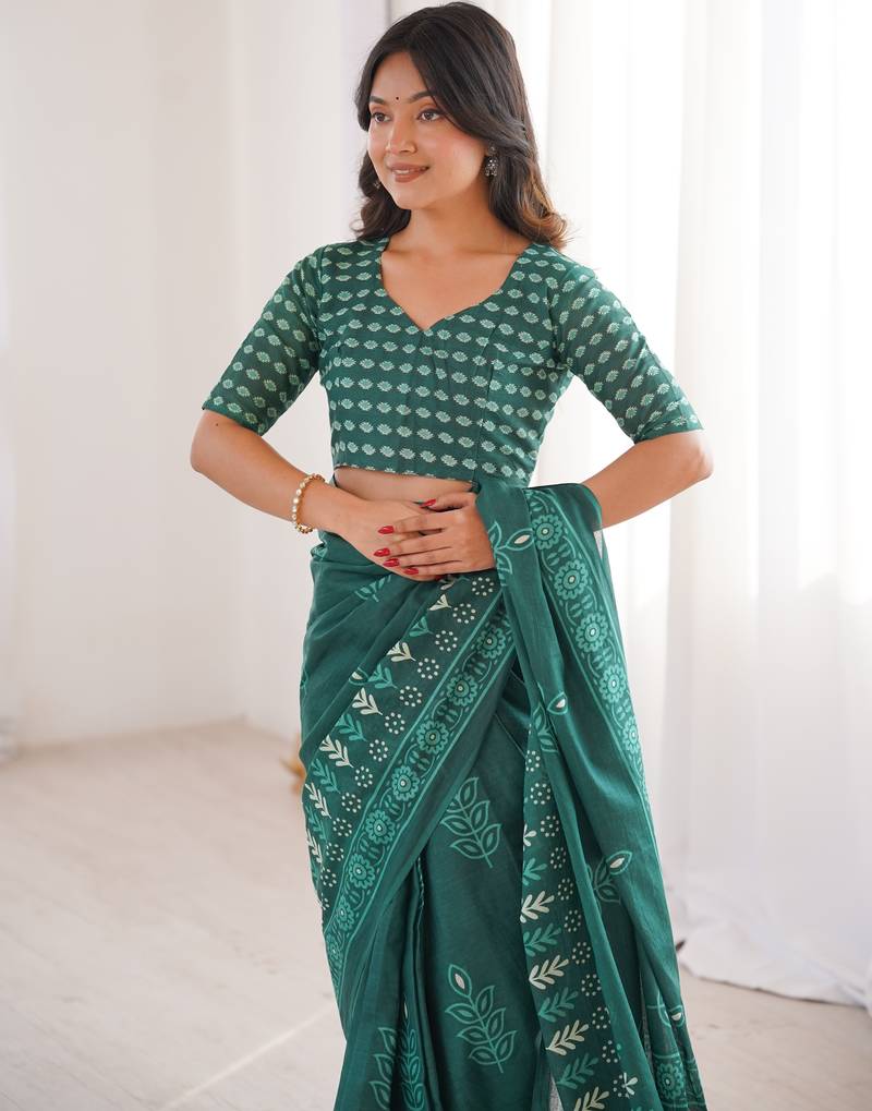 Green blocked printed, floral print soft pure cotton saree with blouse.