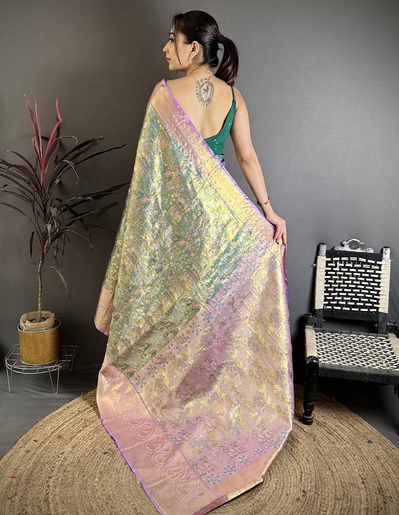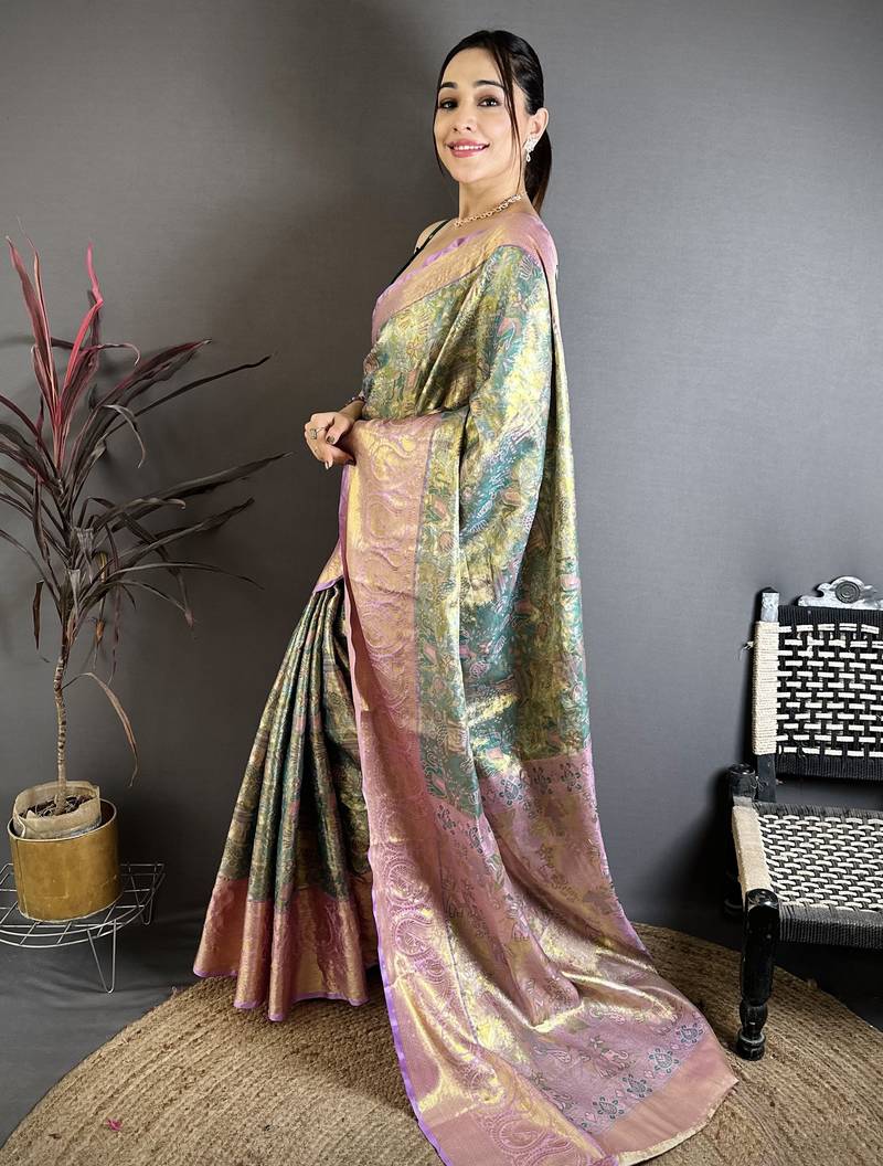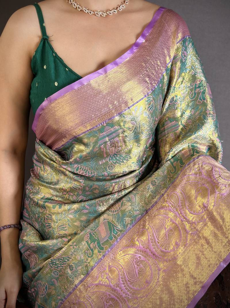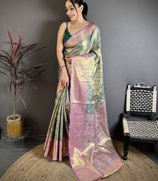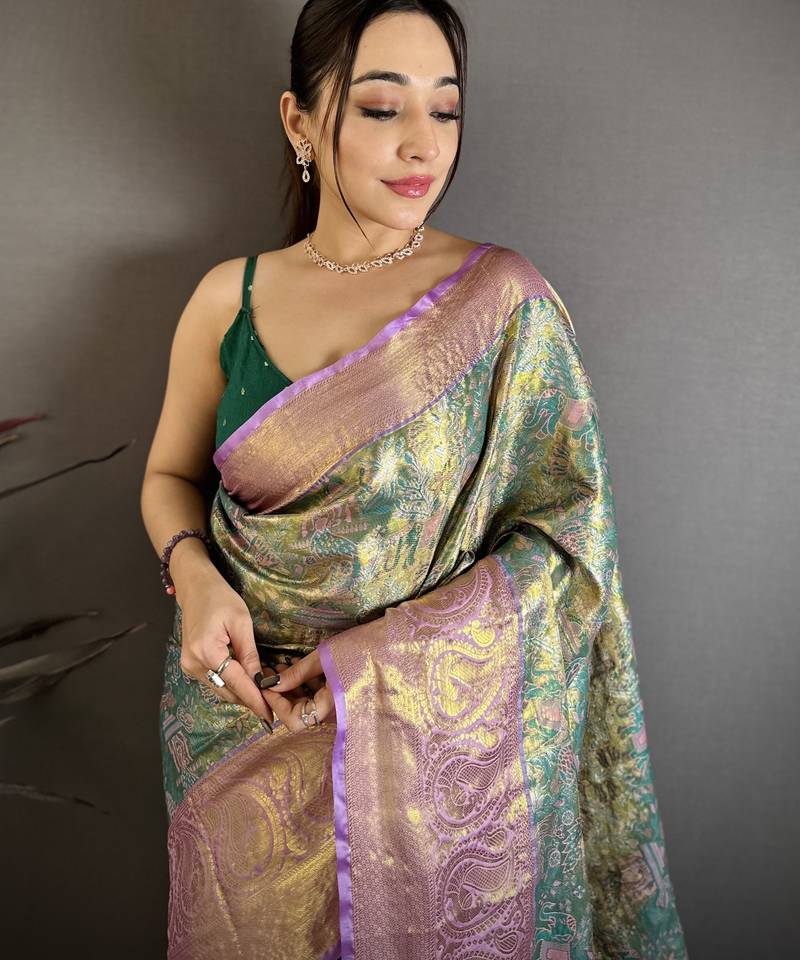 Green floral, meenakari, zari woven kanjivaram semi silk saree with blouse