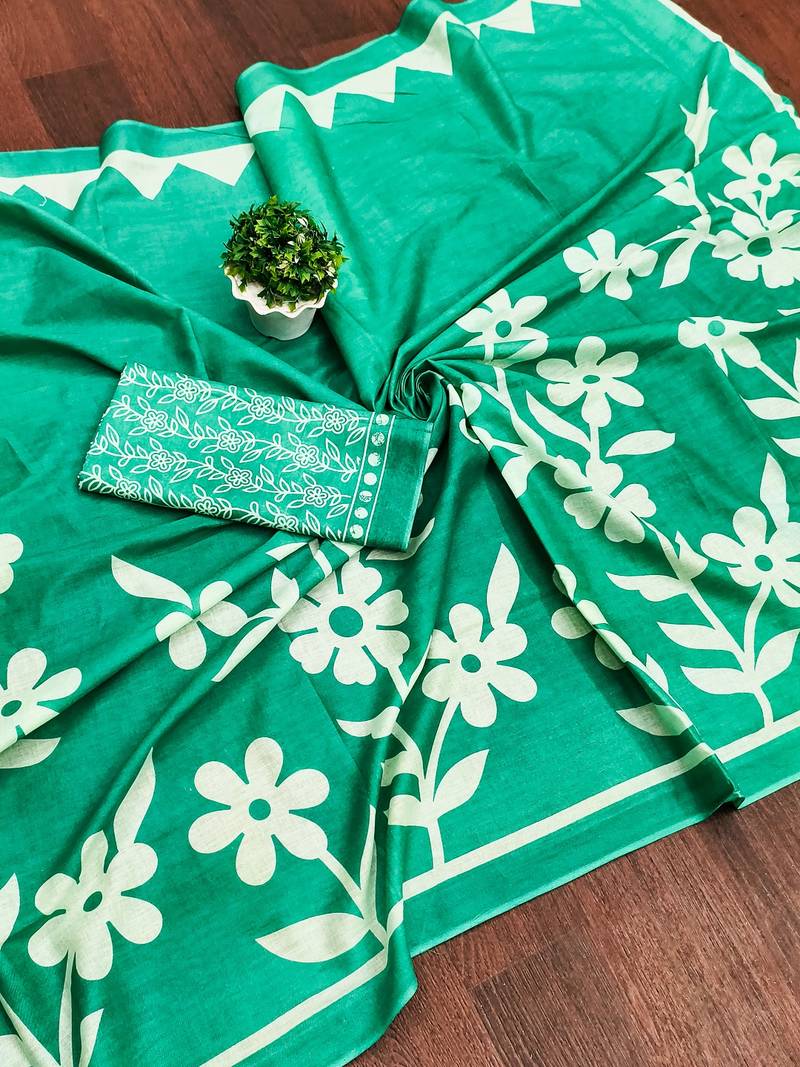 Green floral print mulmul cotton saree with blouse.