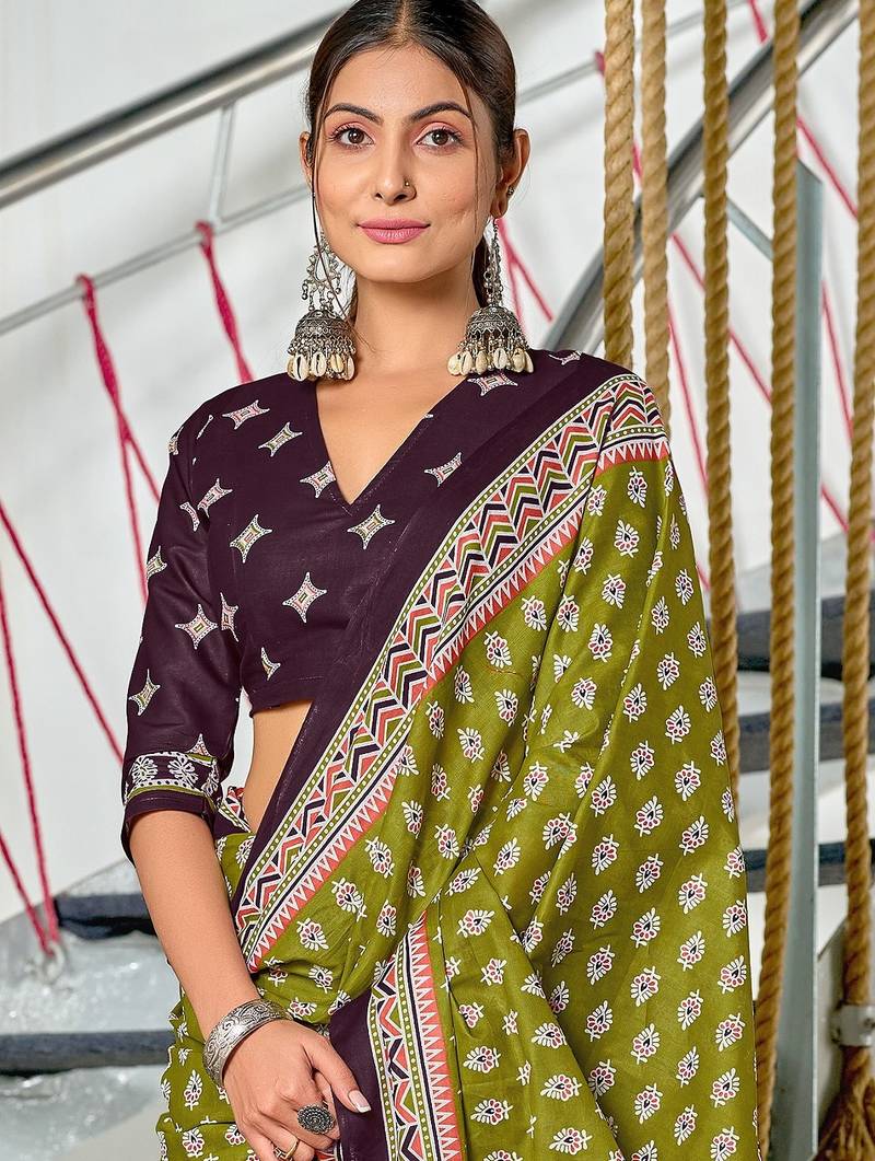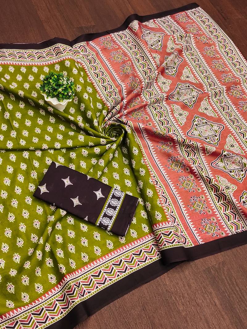 Green floral print mulmul cotton saree with blouse.