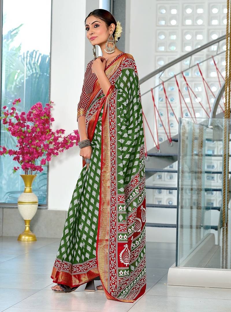 Green floral print pure cotton mulmul saree with blouse.