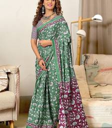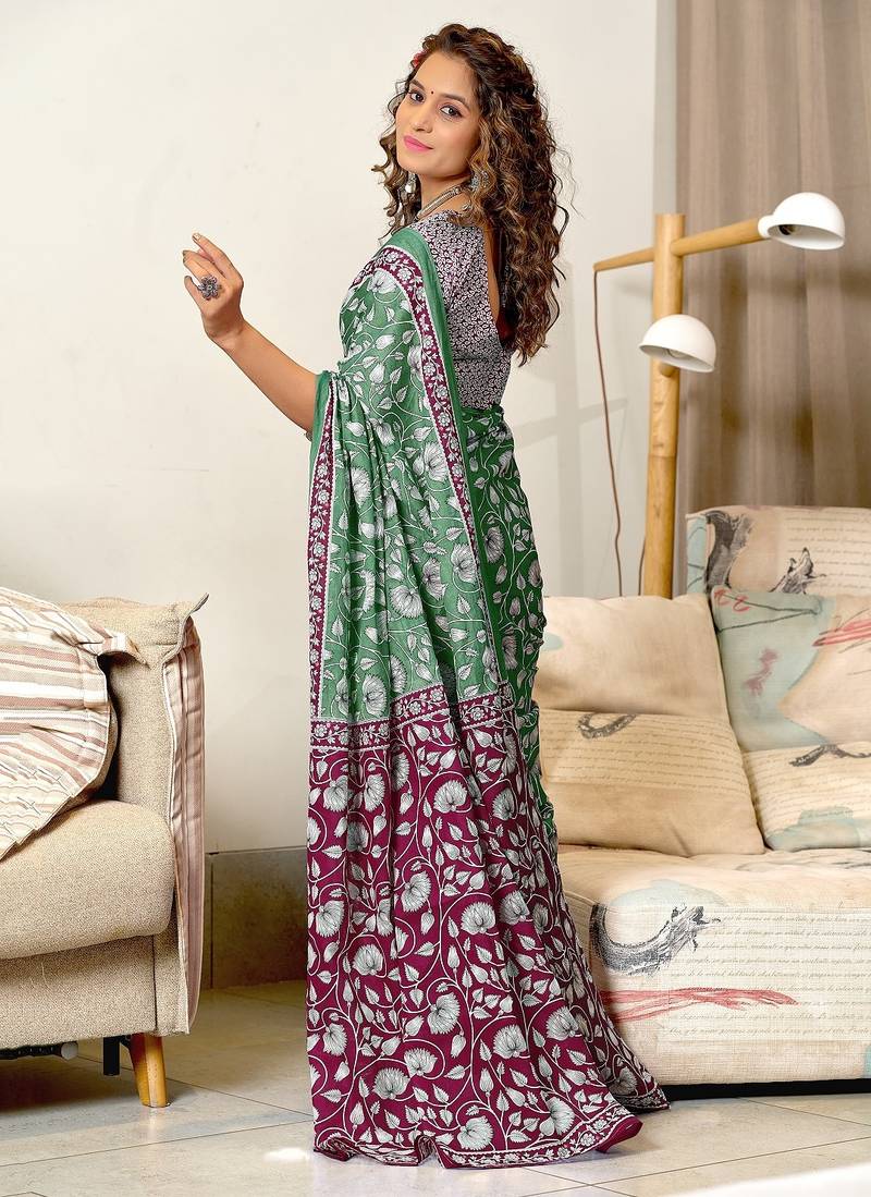 Green floral print soft pure cotton saree with blouse.