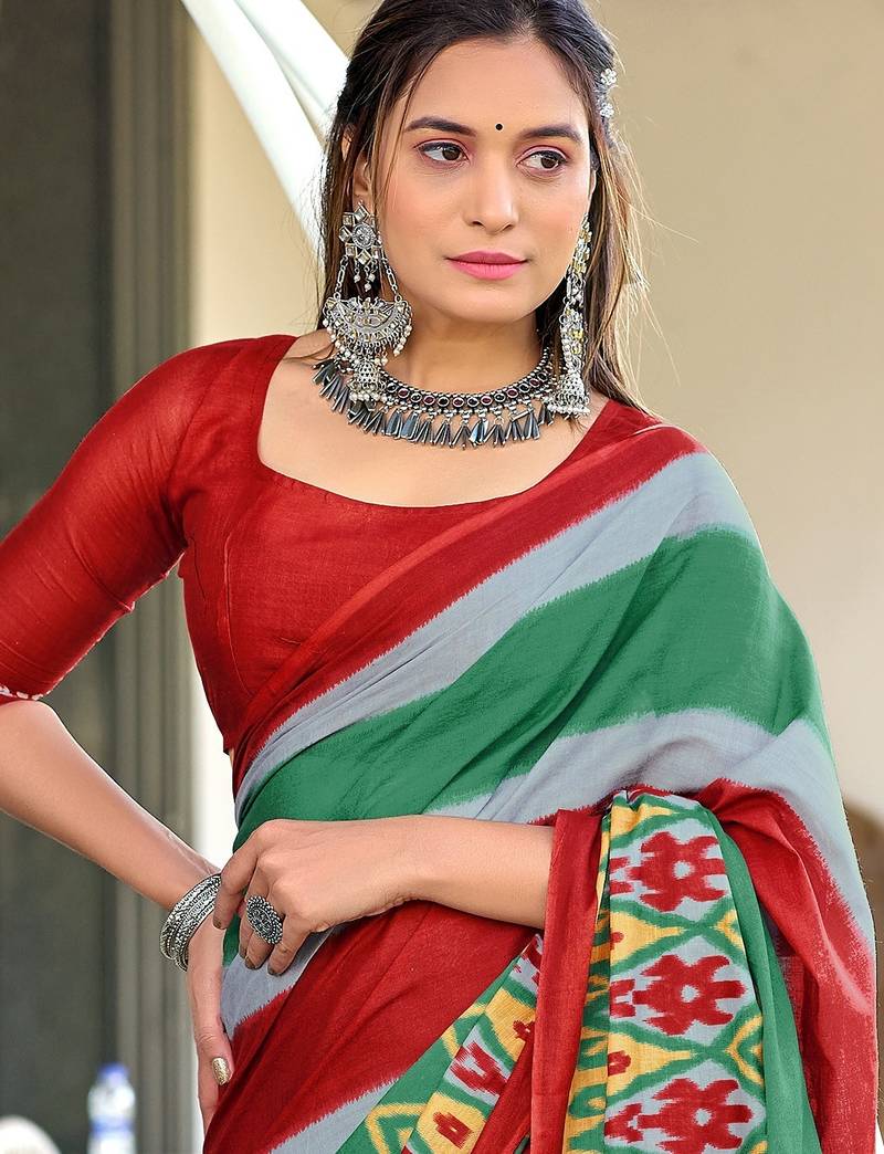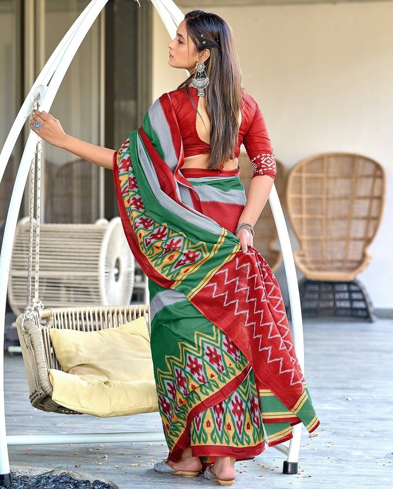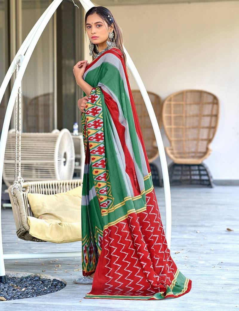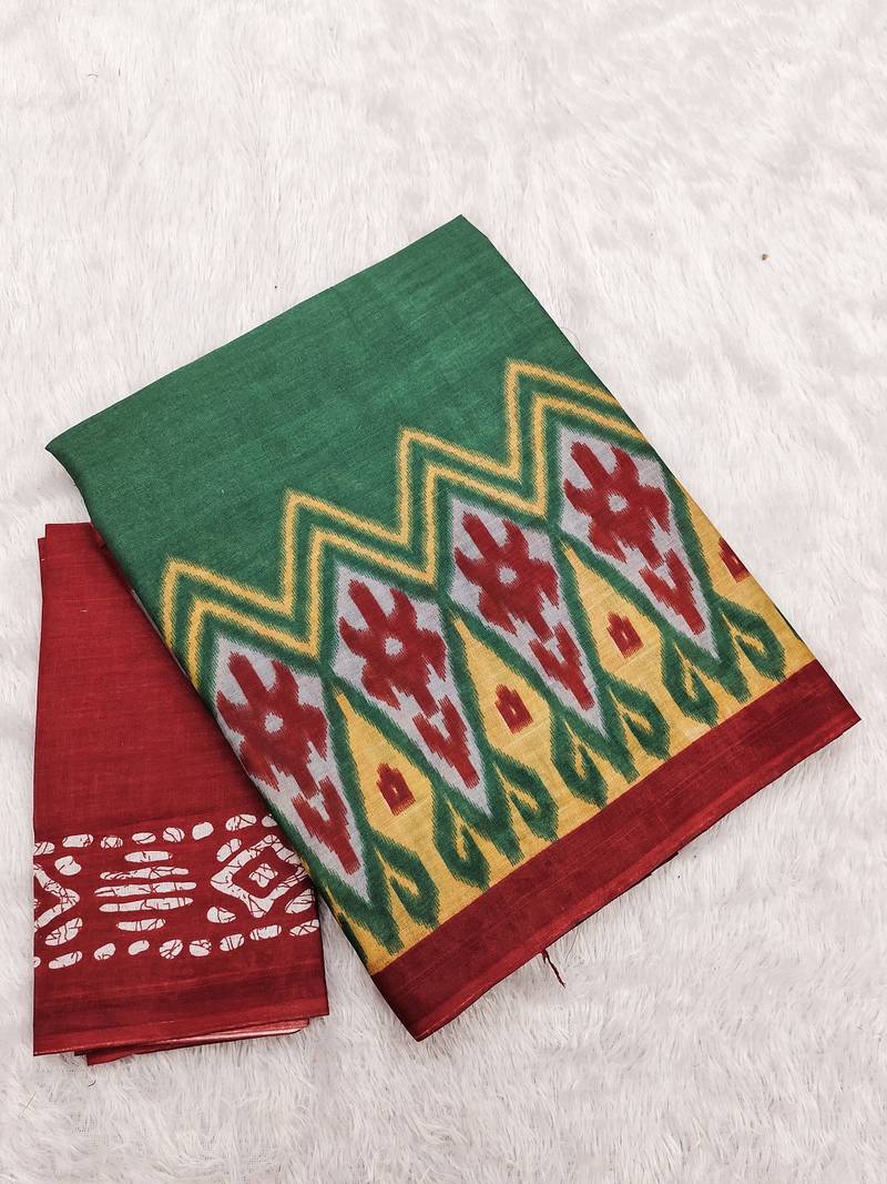 | Product Name | Green Ikkat Print Soft Pure Cotton Saree With Blouse. | |