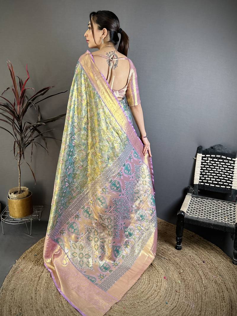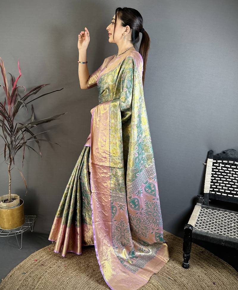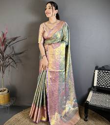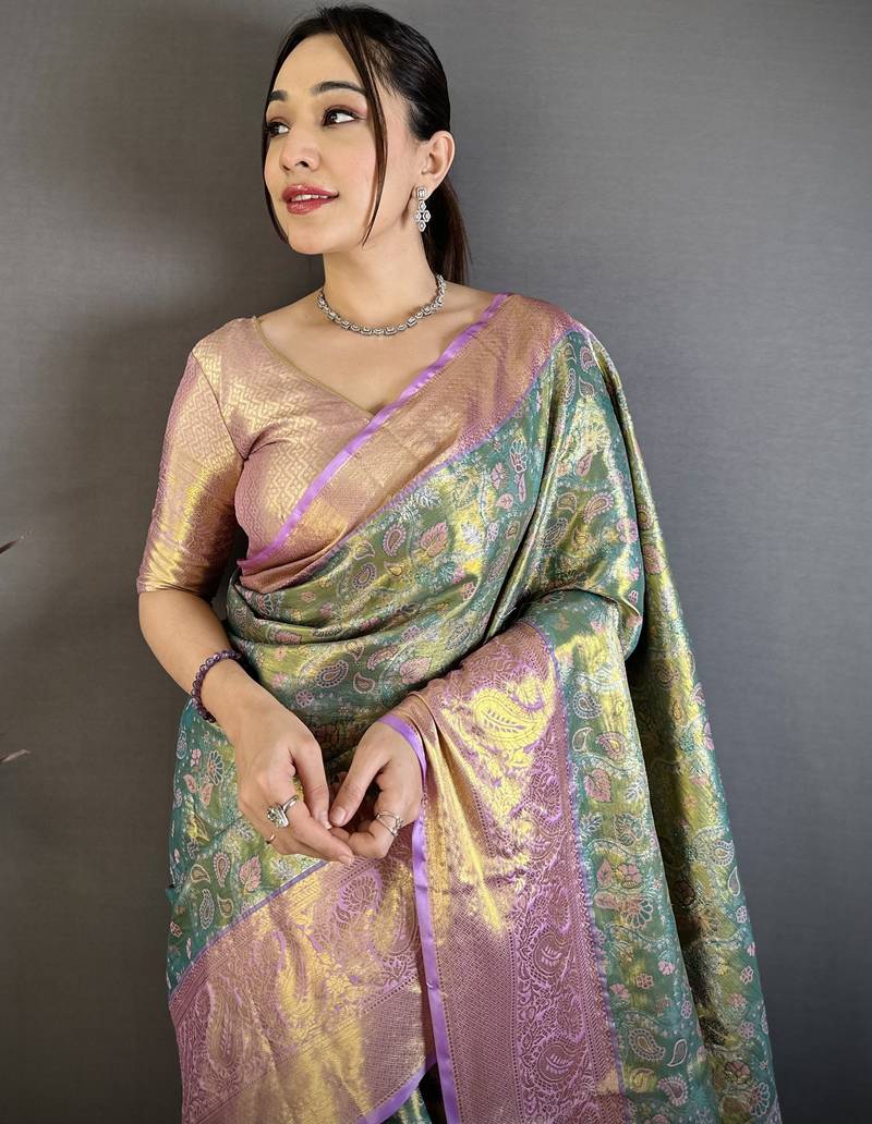Green, lavender floral, paisely, zari woven kanjivaram semi silk saree with blouse