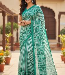 Green striped print soft pure cotton saree with blouse.