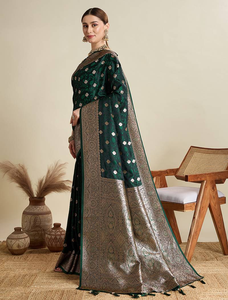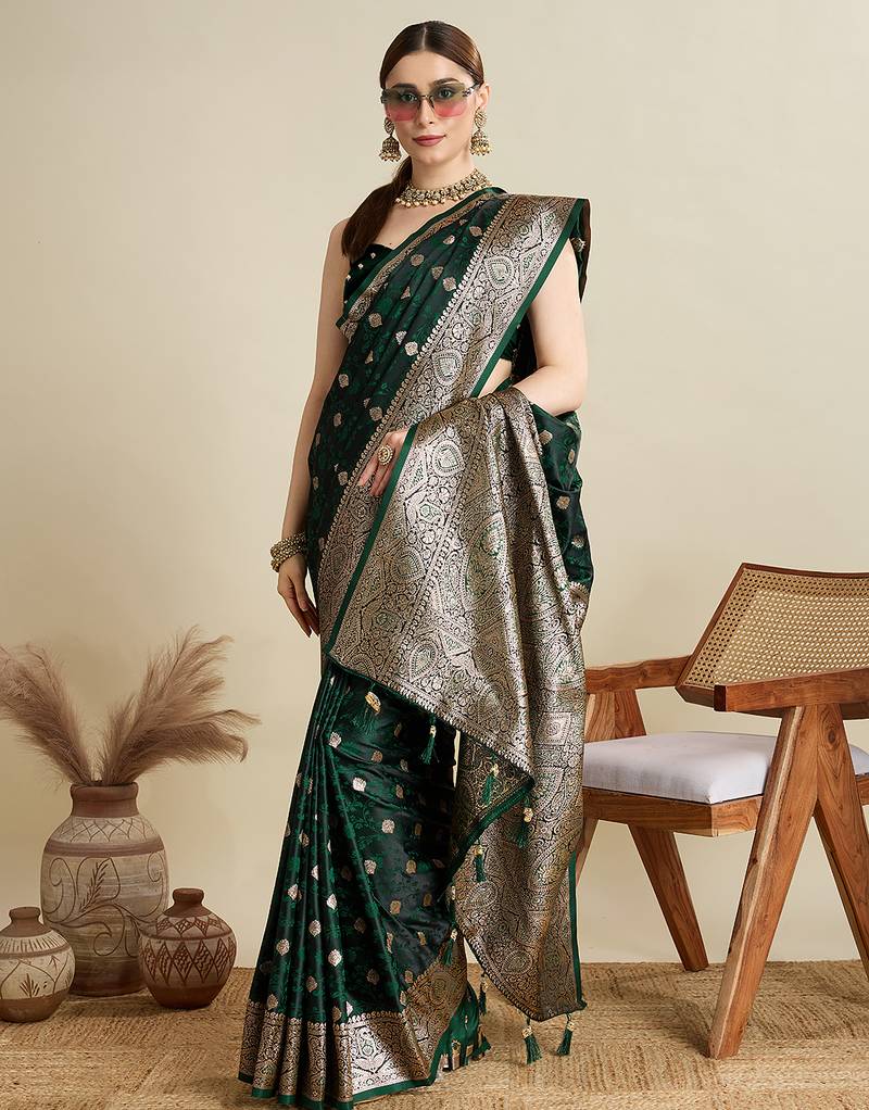 Green woven embellished self design satin silk blend banarasi saree with blouse