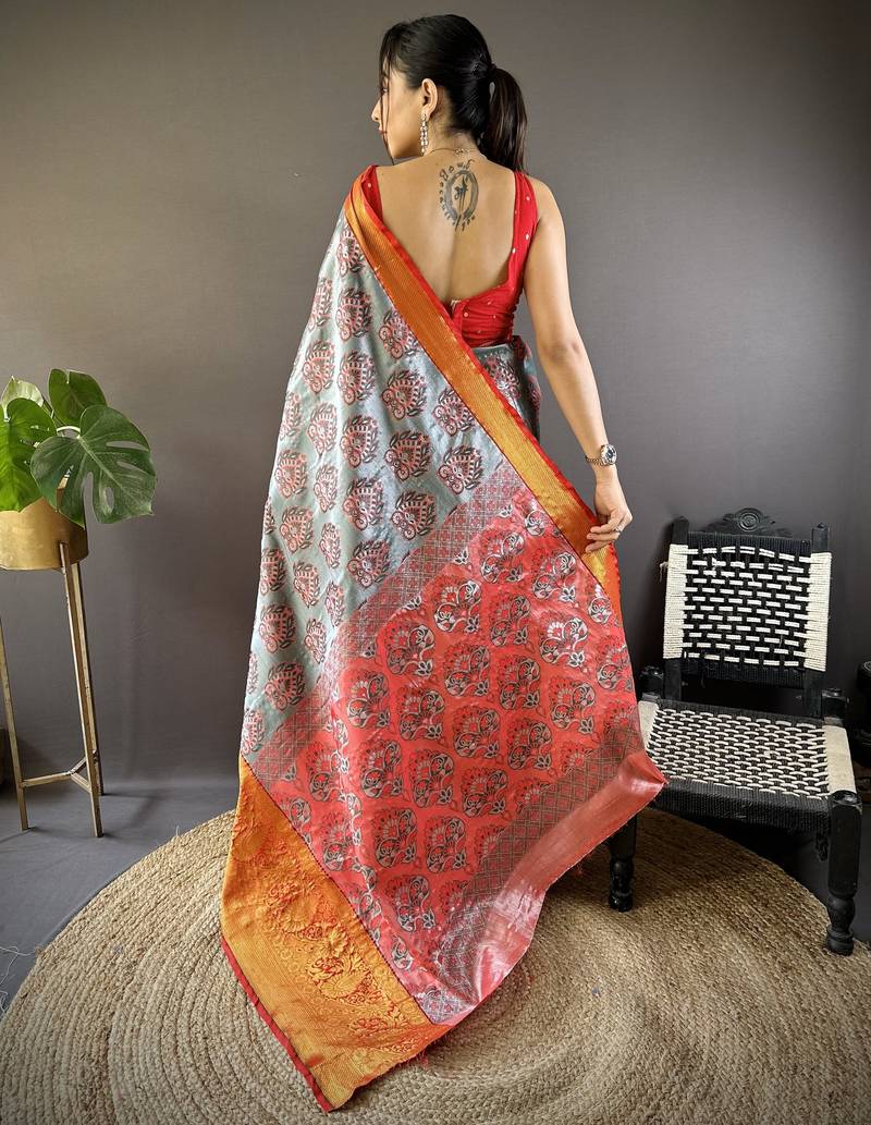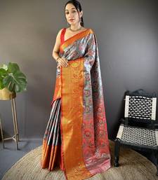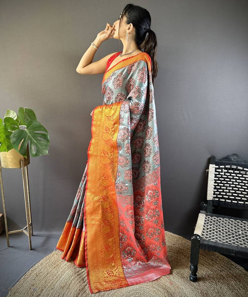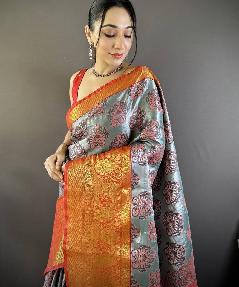 Grey floral, zari woven kanjivaram tissue silk saree with blouse