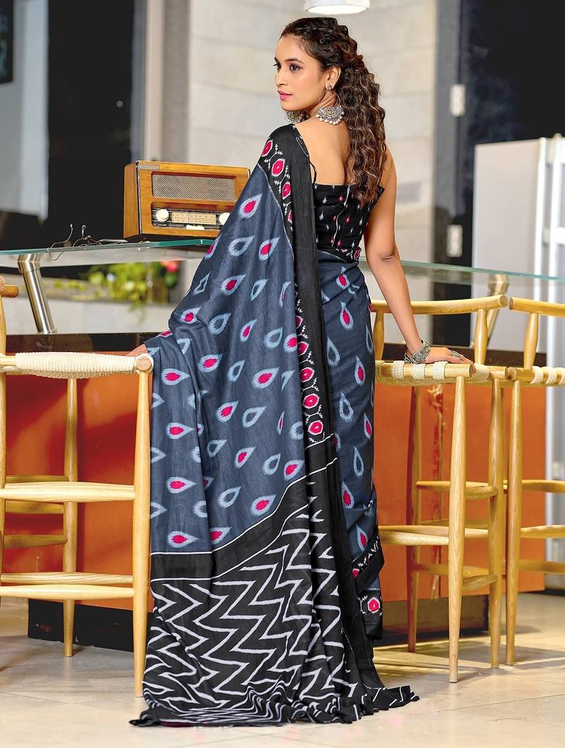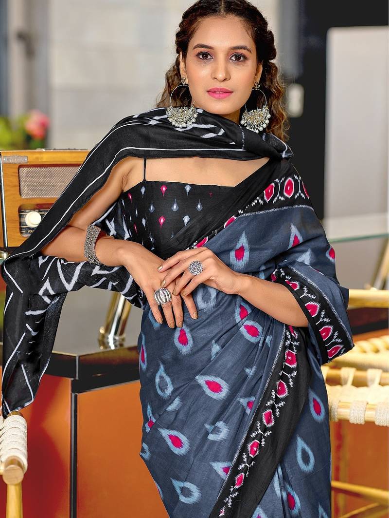 | Product Name | Grey Ikkat Print Mulmul Cotton Saree With Blouse. | |