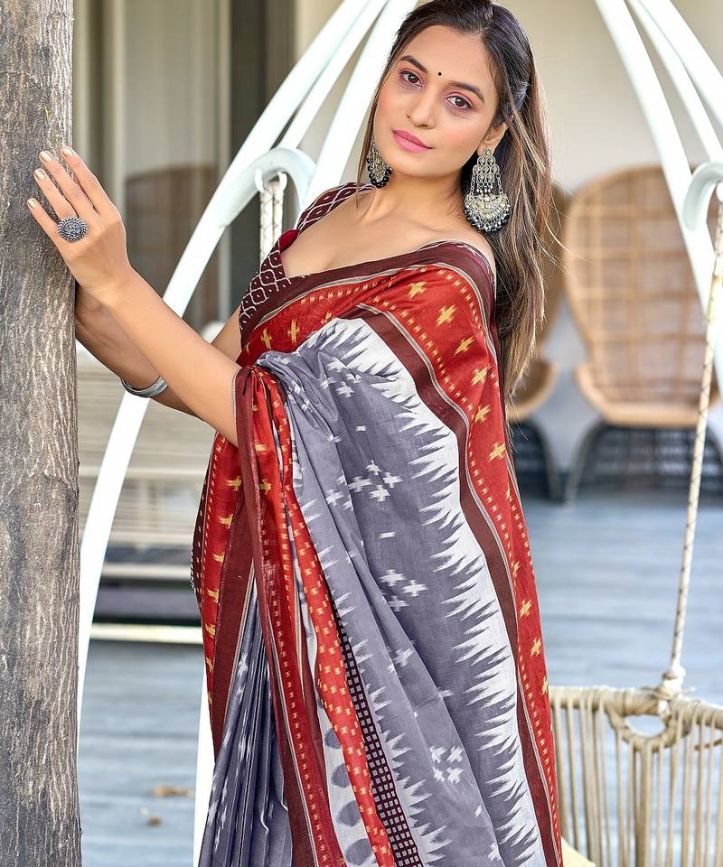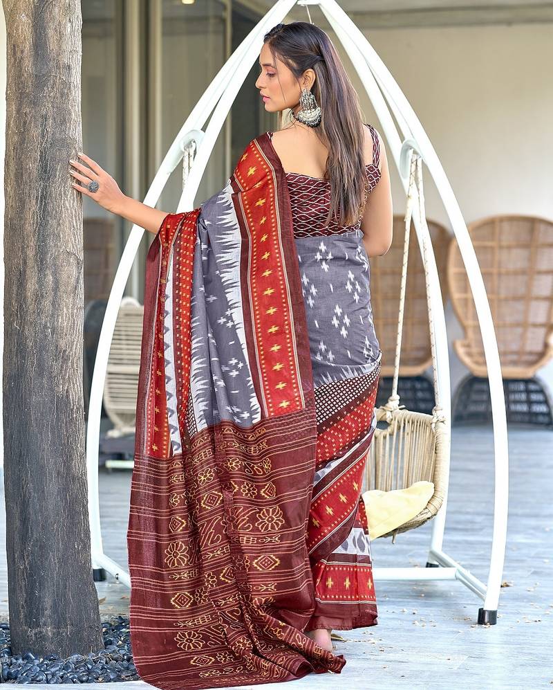 | Product Name | Grey Ikkat Print Mulmul Cotton Saree With Blouse. | |