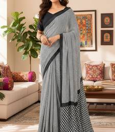 Grey striped print soft pure cotton saree with blouse.