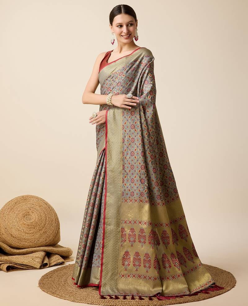 Grey woven self design embellished pure silk banarasi saree with blouse