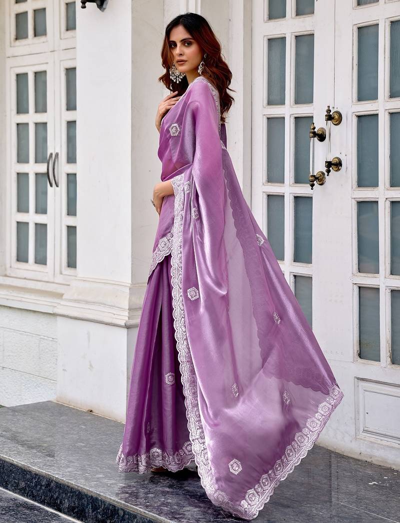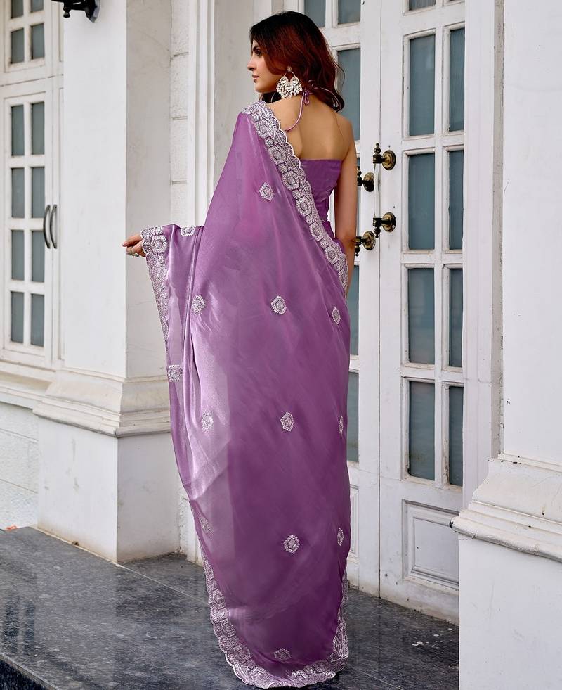 Lavender embroidered embellished shimmer chiffon bollywood saree with blouse