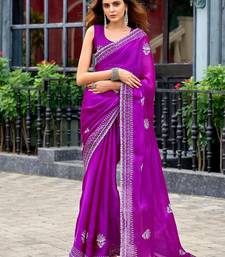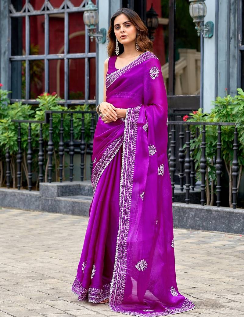 Magenta embroidered embellished shimmer chiffon bollywood saree with blouse