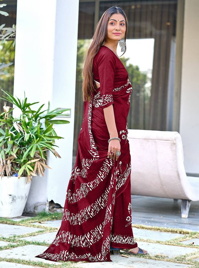Maroon block print soft pure cotton saree with blouse.