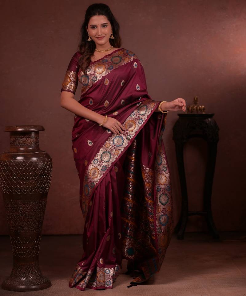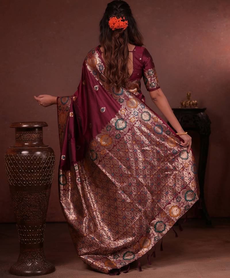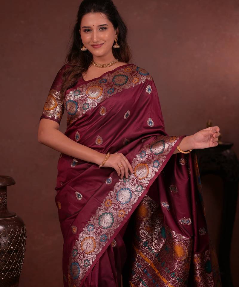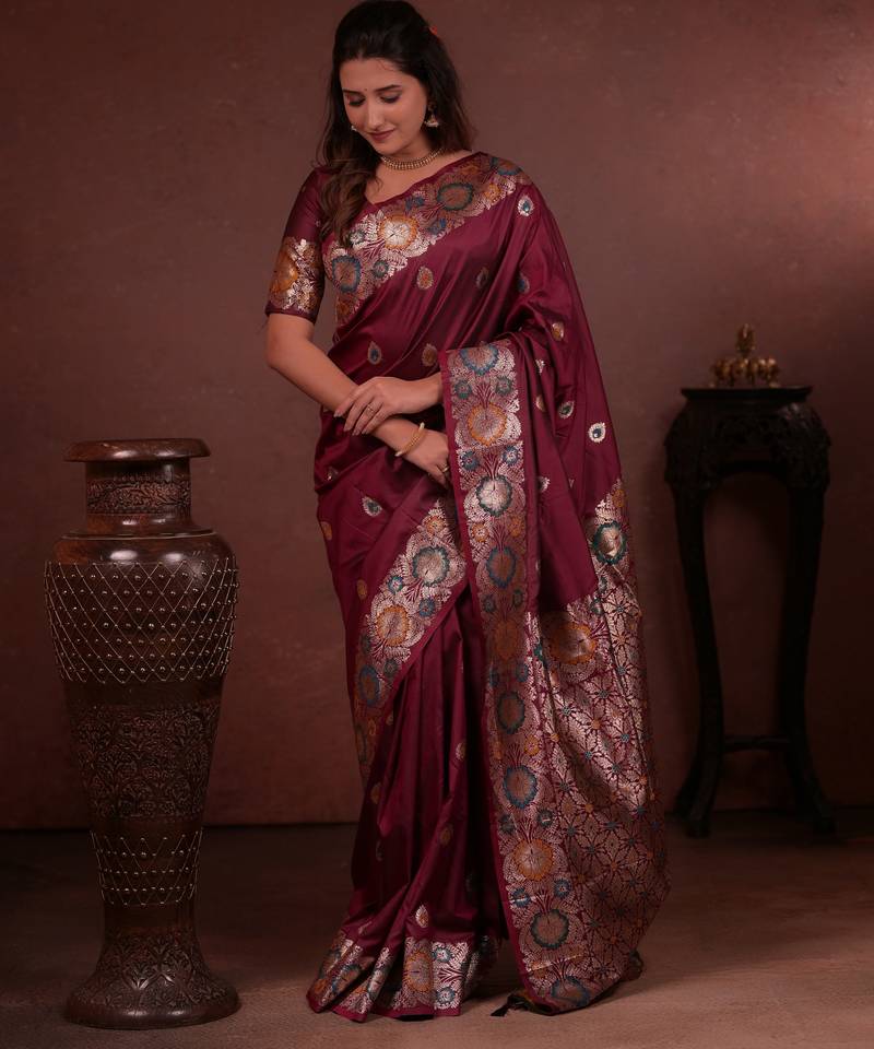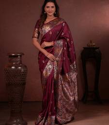 Maroon floral, zari woven faux kanjivaram saree with blouse