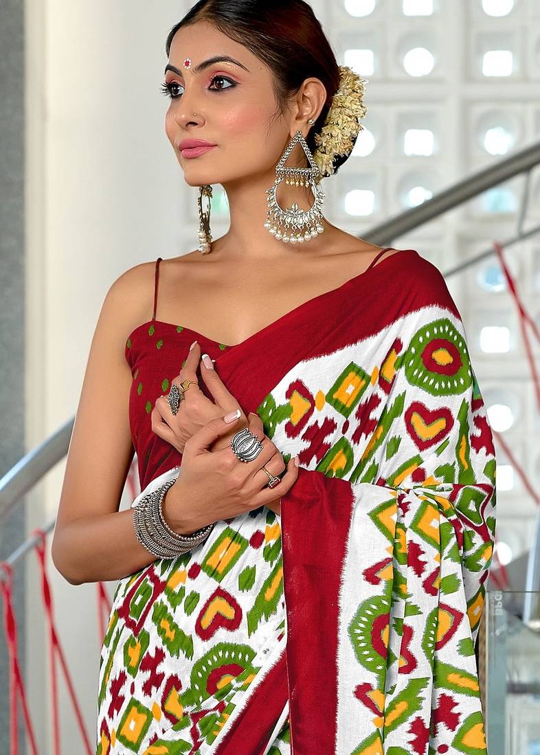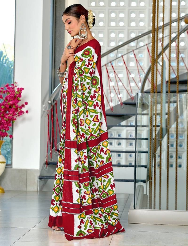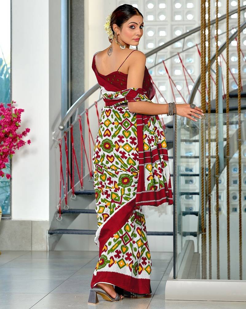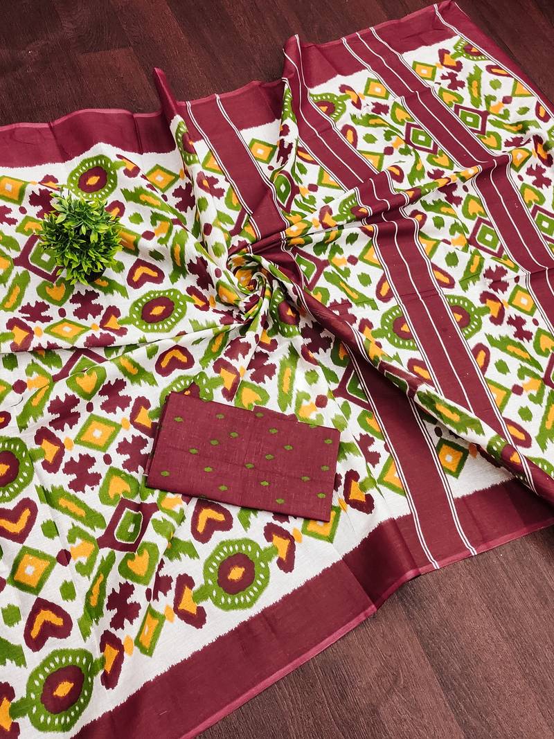 | Product Name | Maroon Ikkat Print Mulmul Cotton Saree With Blouse. | |