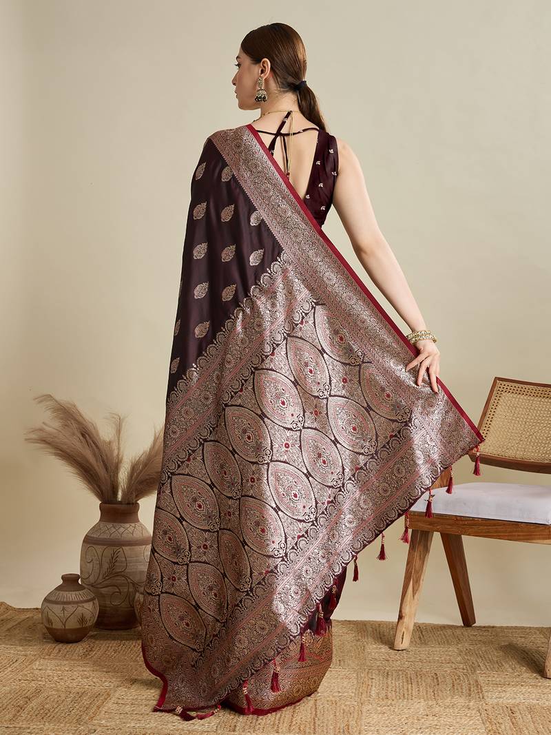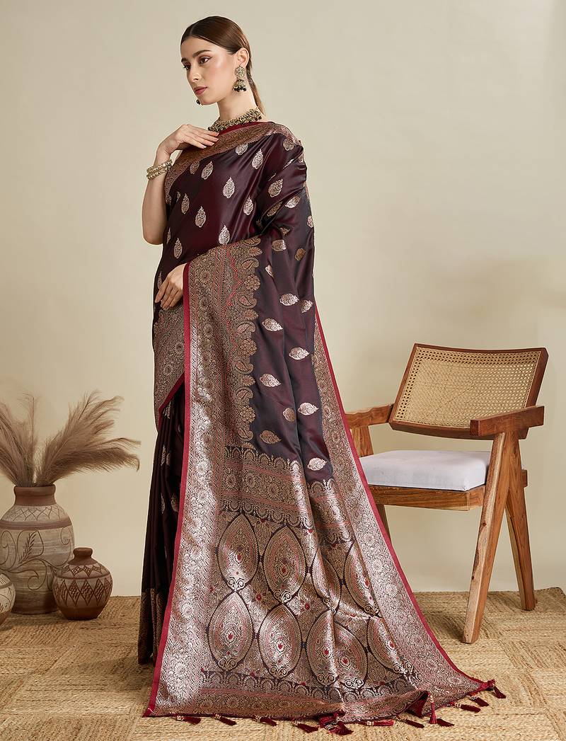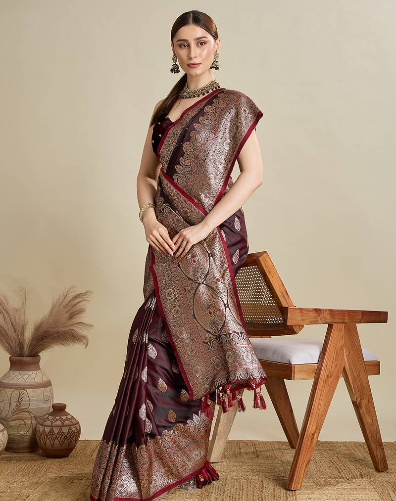 Maroon woven embellished self design satin silk blend banarasi saree with blouse