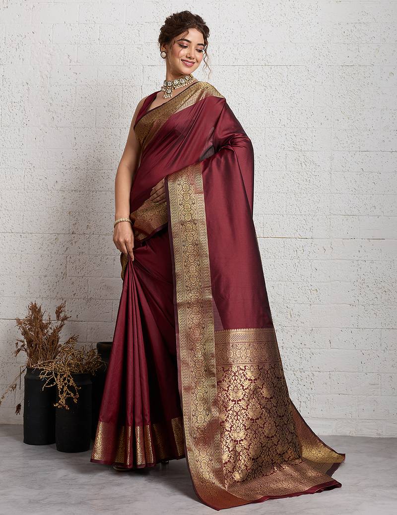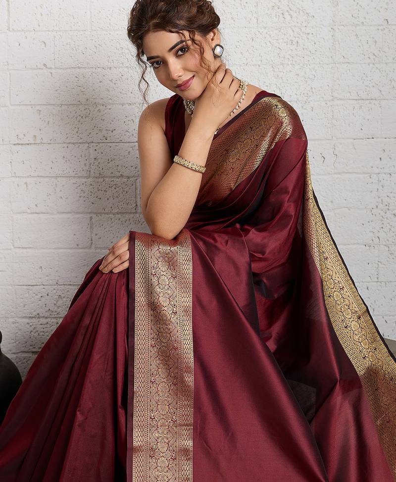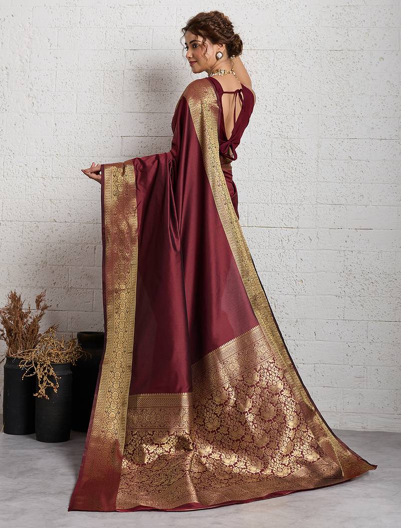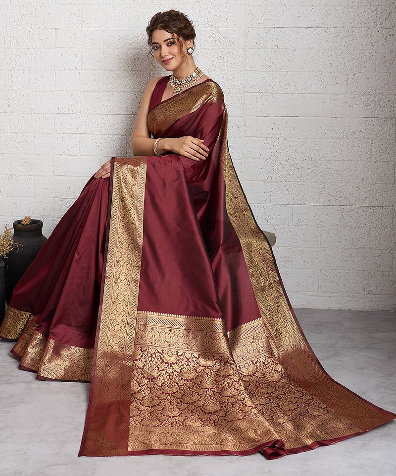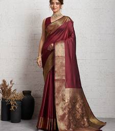 Maroon woven, self design, embellished pure silk banarasi saree with blouse