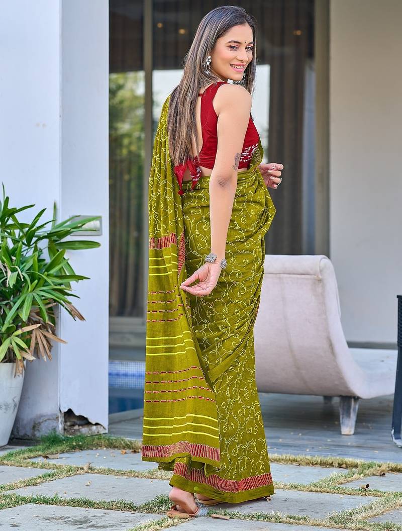 Mehendi block print soft pure cotton saree with blouse.