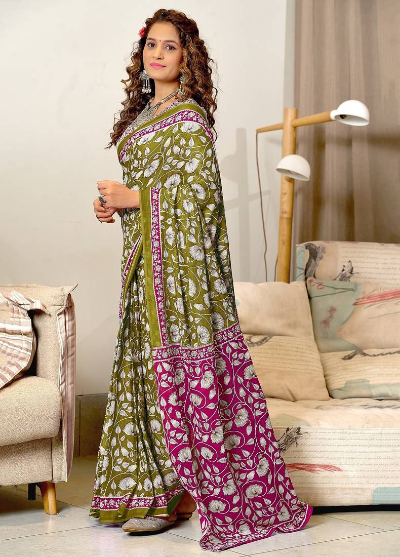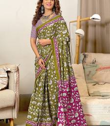 Mehendi floral print soft pure cotton saree with blouse.
