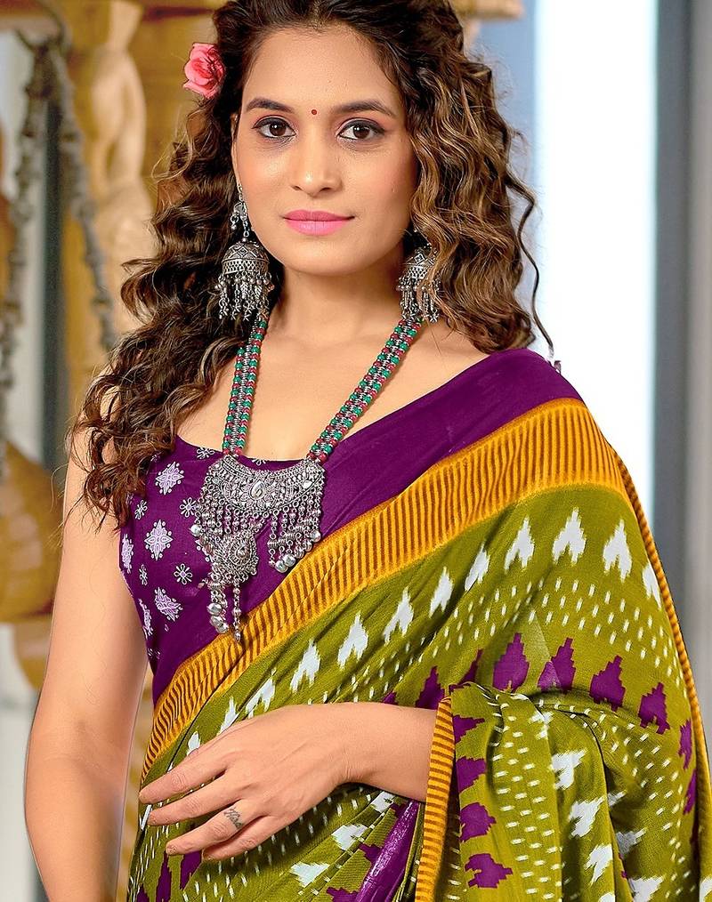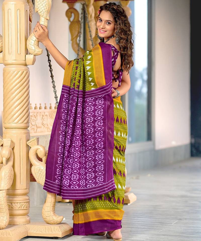 Mehendi ikkat, block print mulmul cotton saree with blouse.