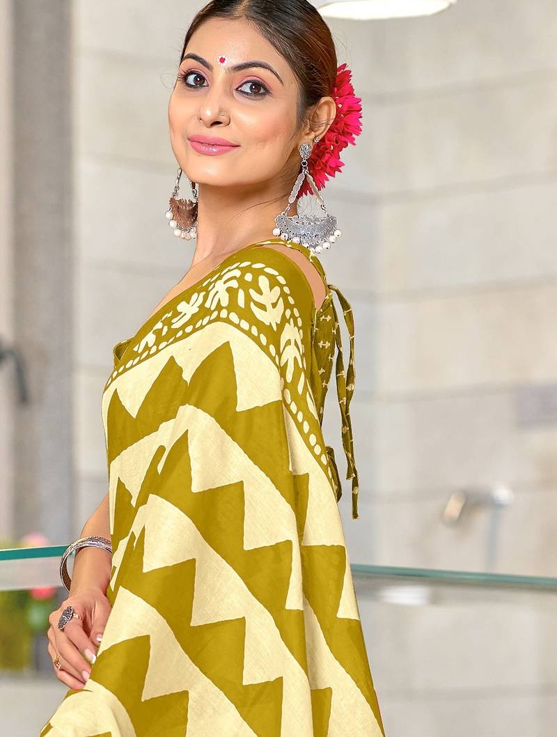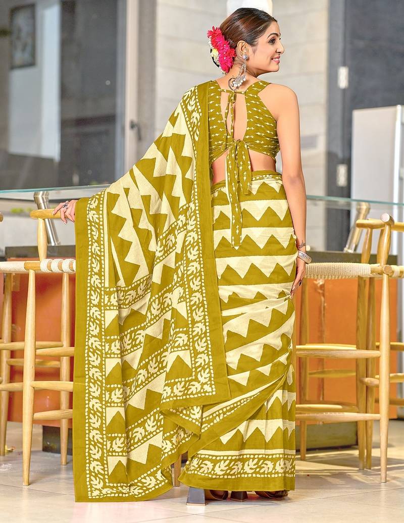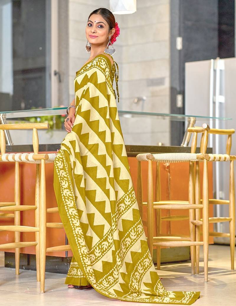 Mehendi zigzag, block print mulmul cotton saree with blouse.