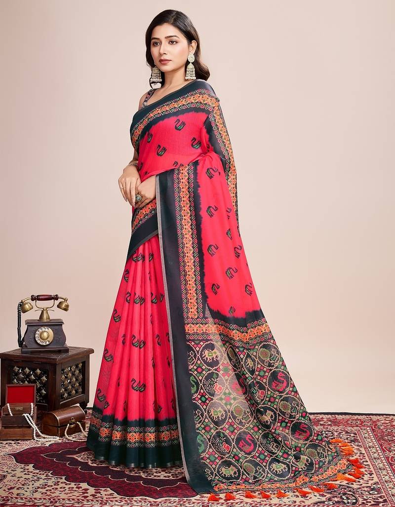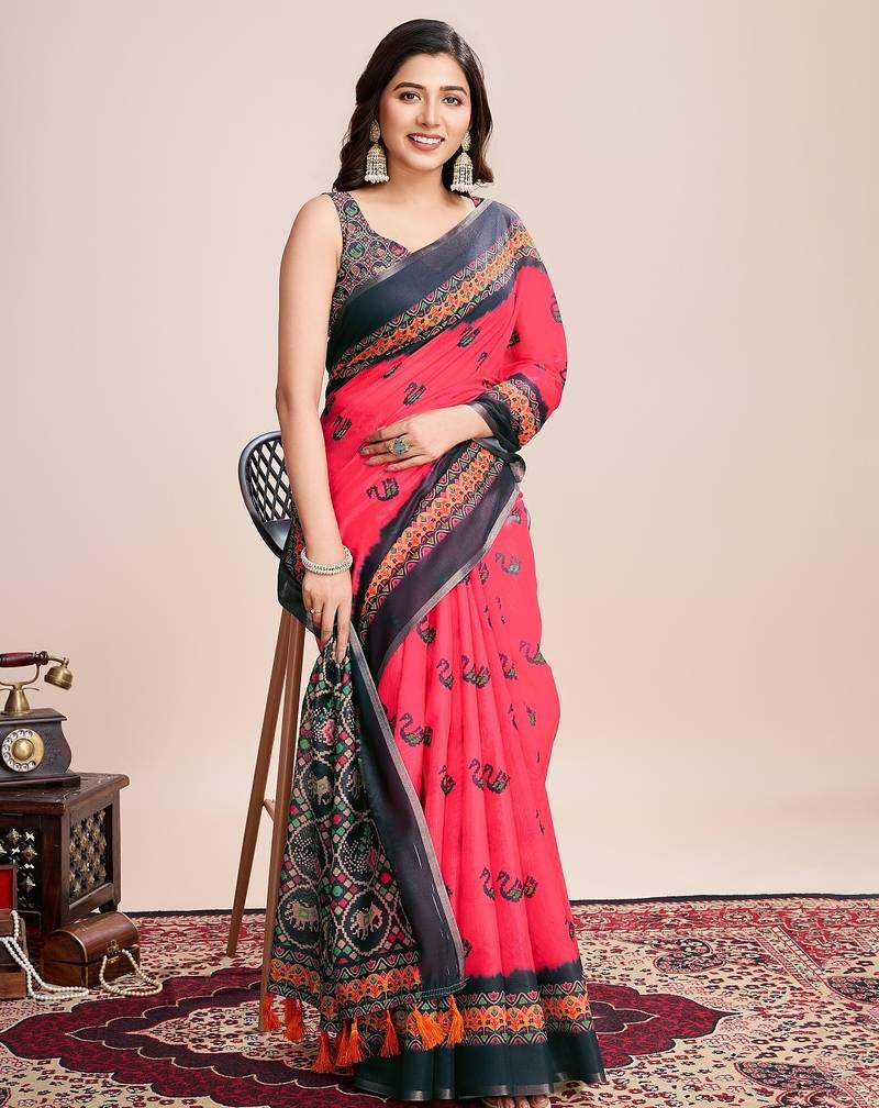 Multicolor printed floral print geometric print cotton linen bollywood saree with blouse