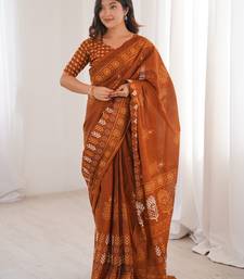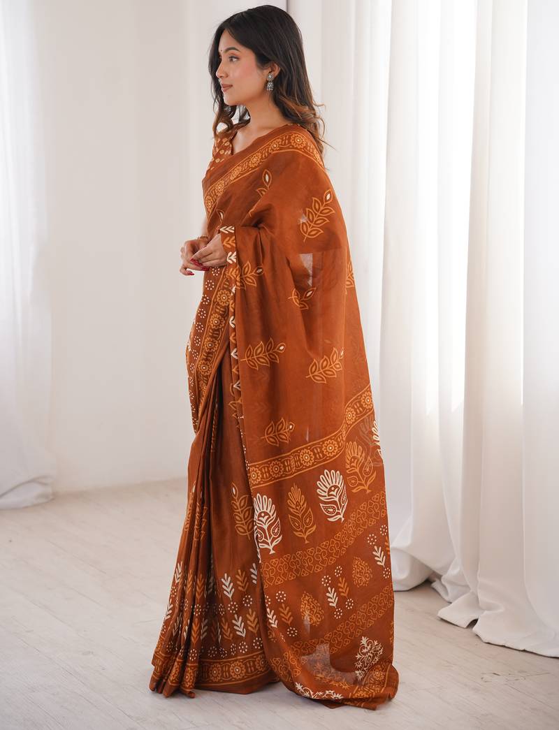 Mustard blocked printed, floral print soft pure cotton saree with blouse.