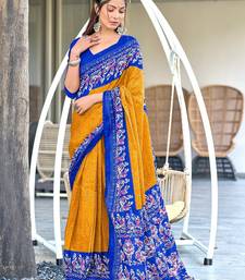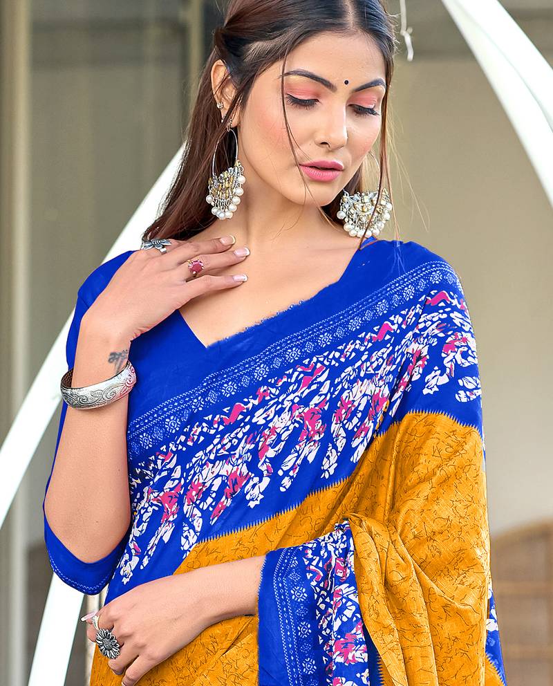 Mustard, blue batik print soft pure cotton saree with blouse.