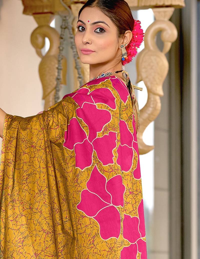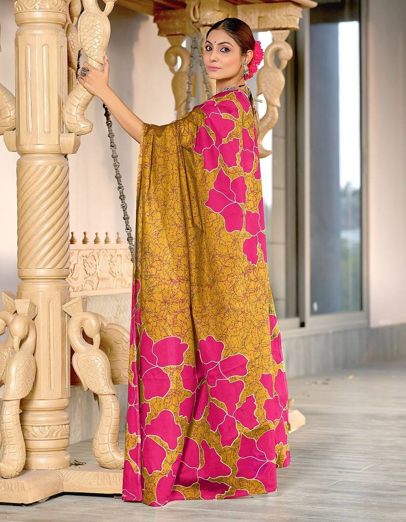 Mustard floral, batik print soft pure cotton saree with blouse.