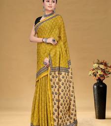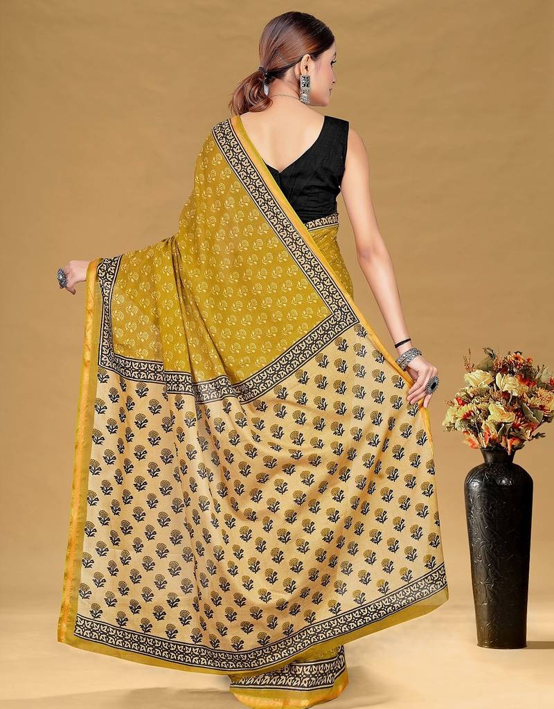 Mustard floral print muslin cotton saree with blouse.