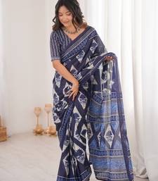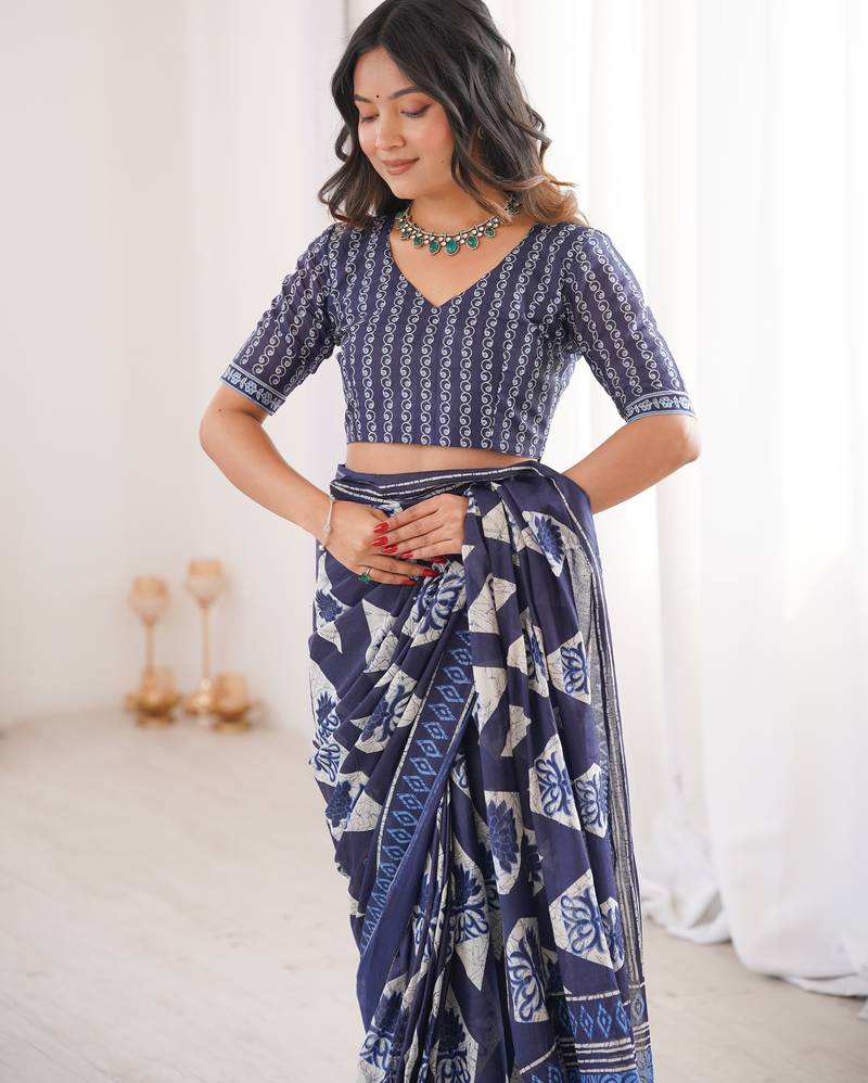 Navy blue blocked printed, floral print, geometric print soft pure cotton saree with blouse.
