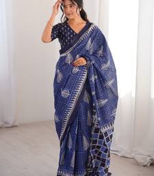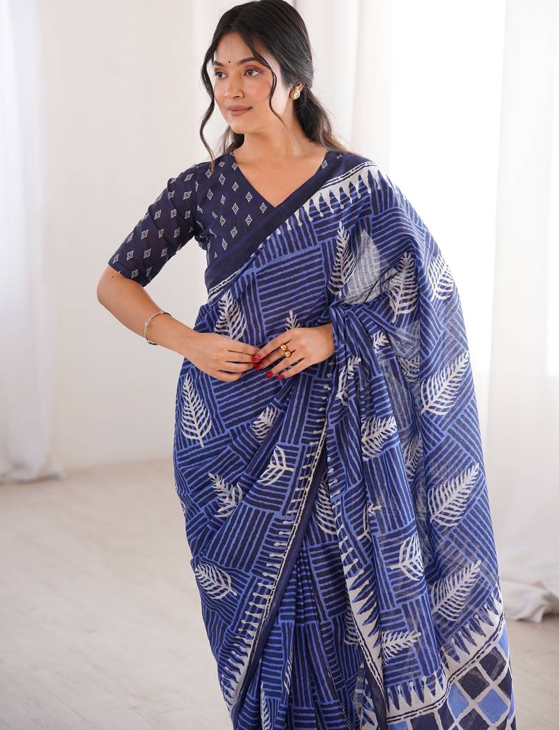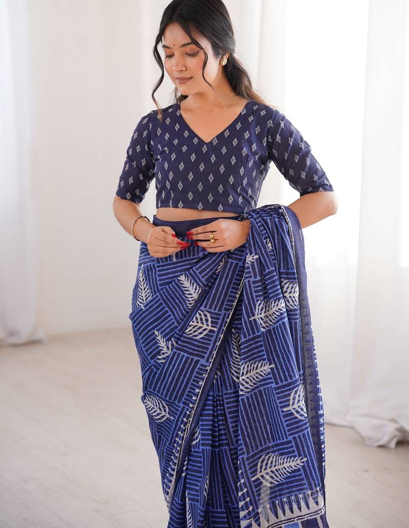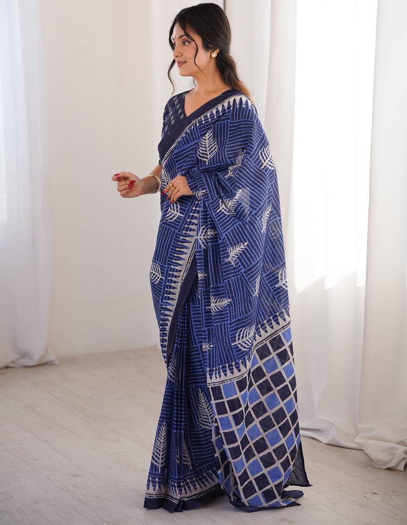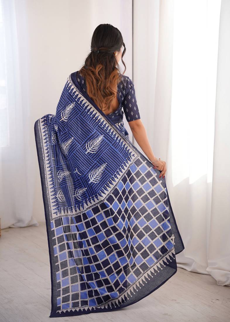Navy blue blocked printed, floral print, geometric print soft pure cotton saree with blouse.