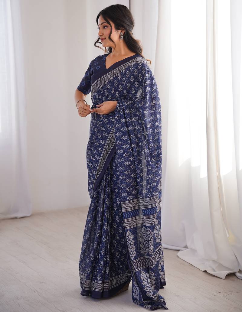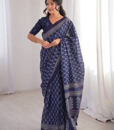 Navy blue blocked printed, floral print soft pure cotton saree with blouse.
