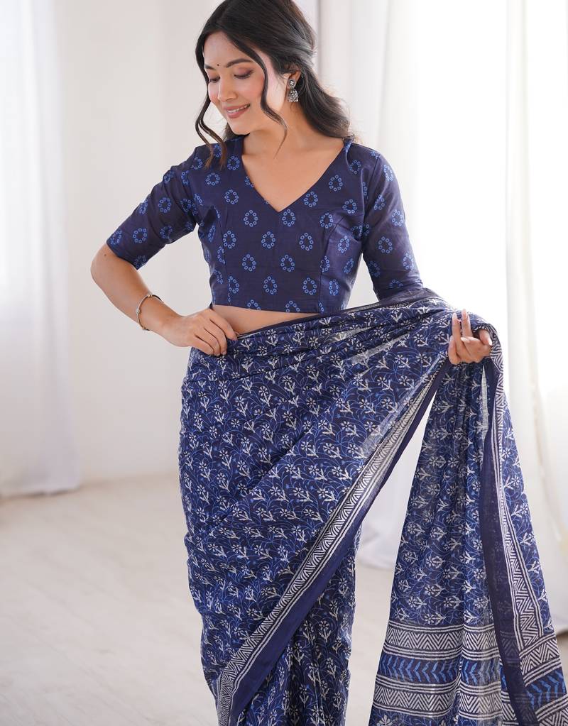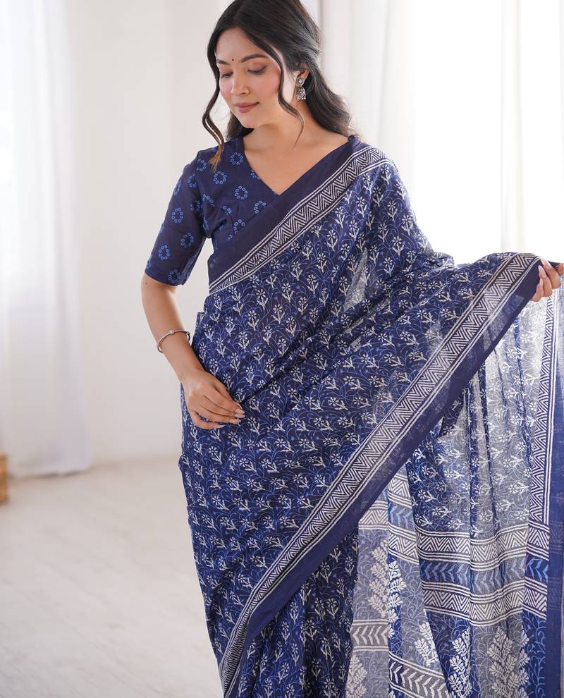 | Product Name | Navy Blue Blocked Printed, Floral Print Soft Pure Cotton Saree With Blouse. | |