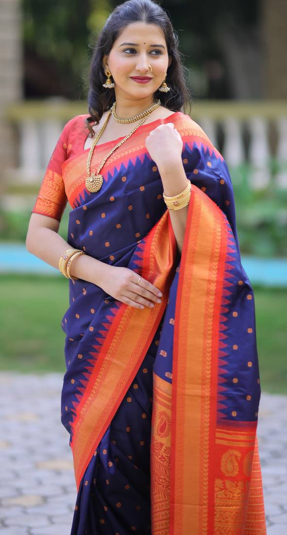 | Product Name | Navy Blue Floral, Temple Border, Zari Work Kanji Gadwal Silk Saree With Blouse | |