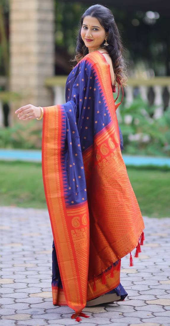 Navy blue floral, temple border, zari work kanji gadwal silk saree with blouse