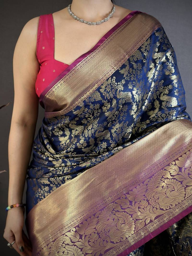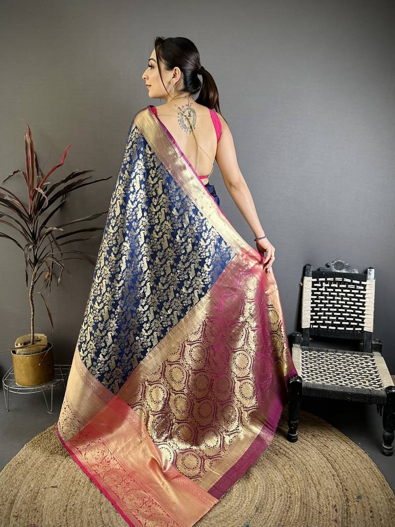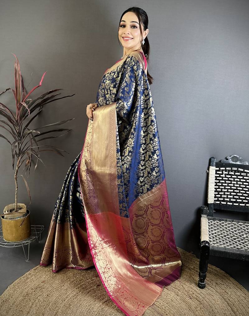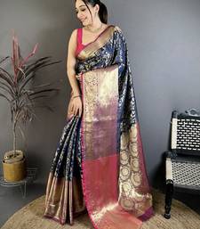 Navy blue floral, zari work kanjivaram katan silk saree with blouse