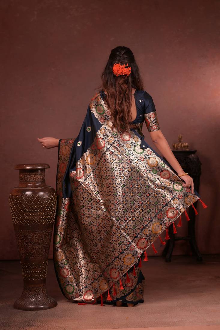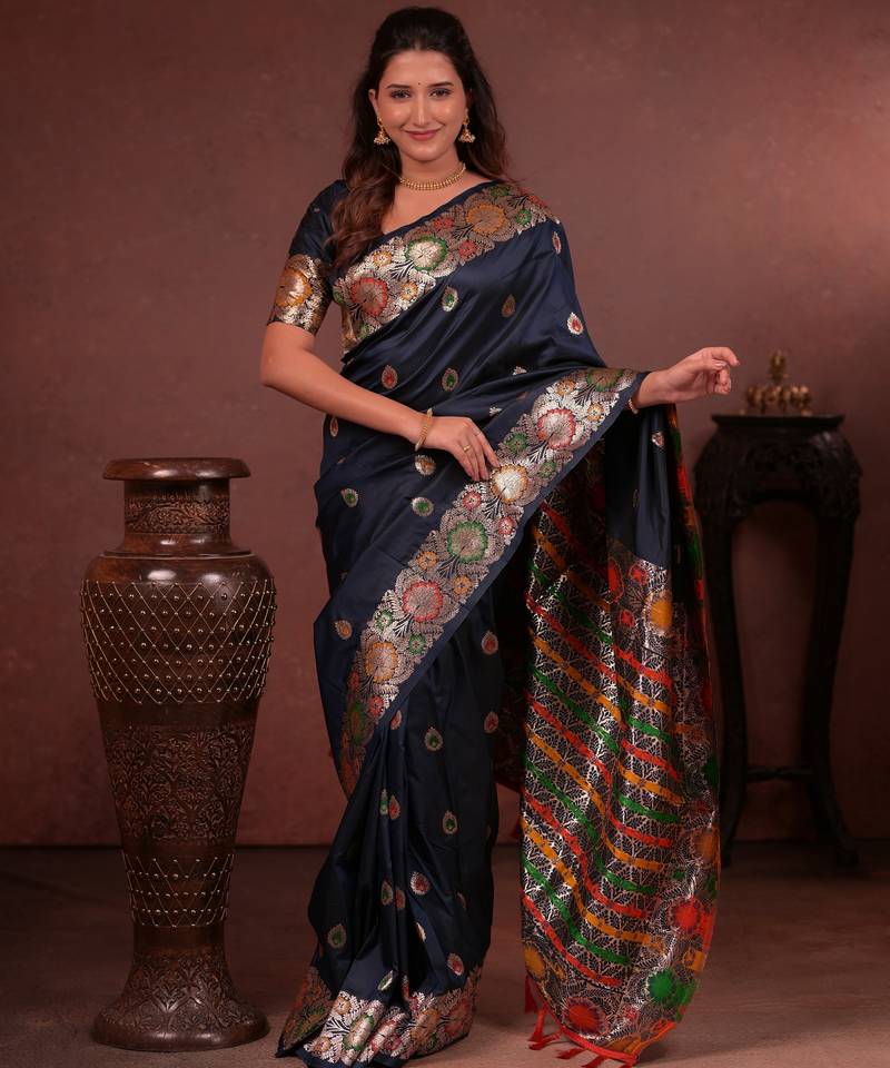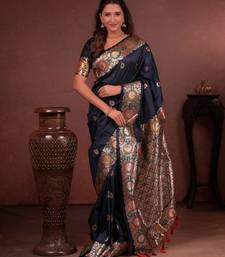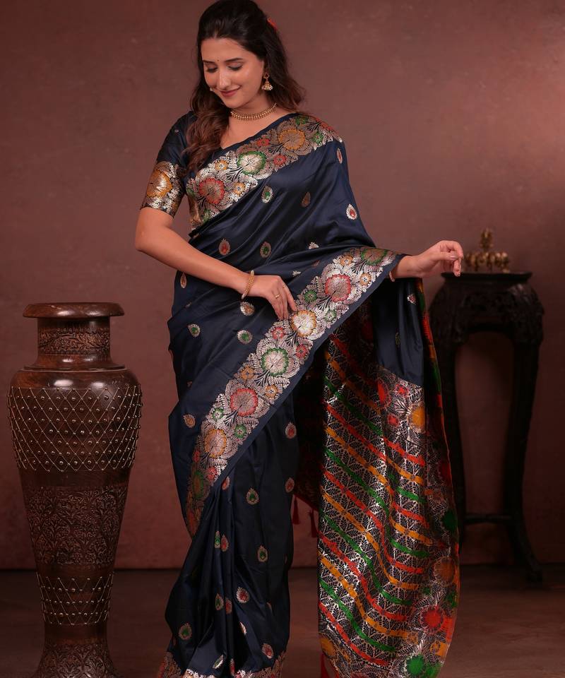 Navy blue floral, zari woven faux kanjivaram saree with blouse