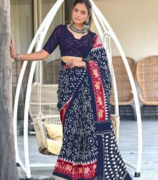 Navy blue ikkat print mulmul cotton saree with blouse.