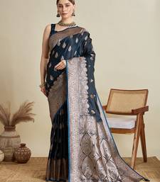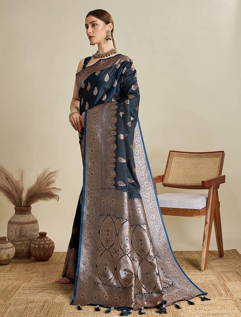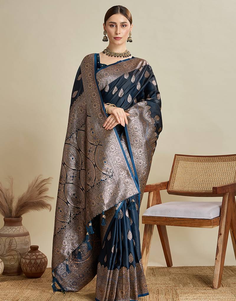 Navy blue woven embellished self design satin silk blend banarasi saree with blouse