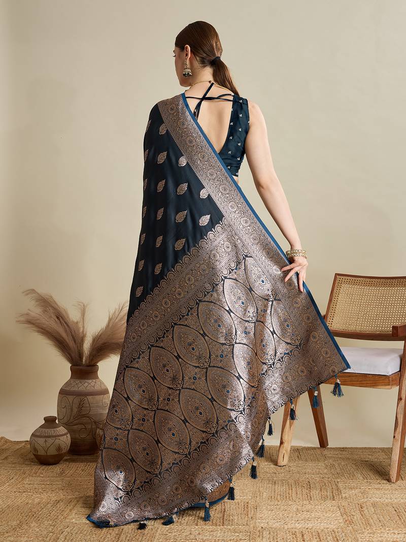 | Product Name | Navy Blue Woven Embellished Self Design Satin Silk Blend Banarasi Saree With Blouse | |