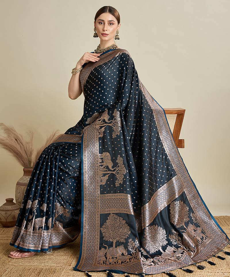 | Product Name | Navy Blue Woven Embellished Self Design Satin Silk Blend Banarasi Saree With Blouse | |