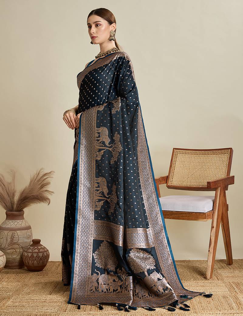 Navy blue woven embellished self design satin silk blend banarasi saree with blouse