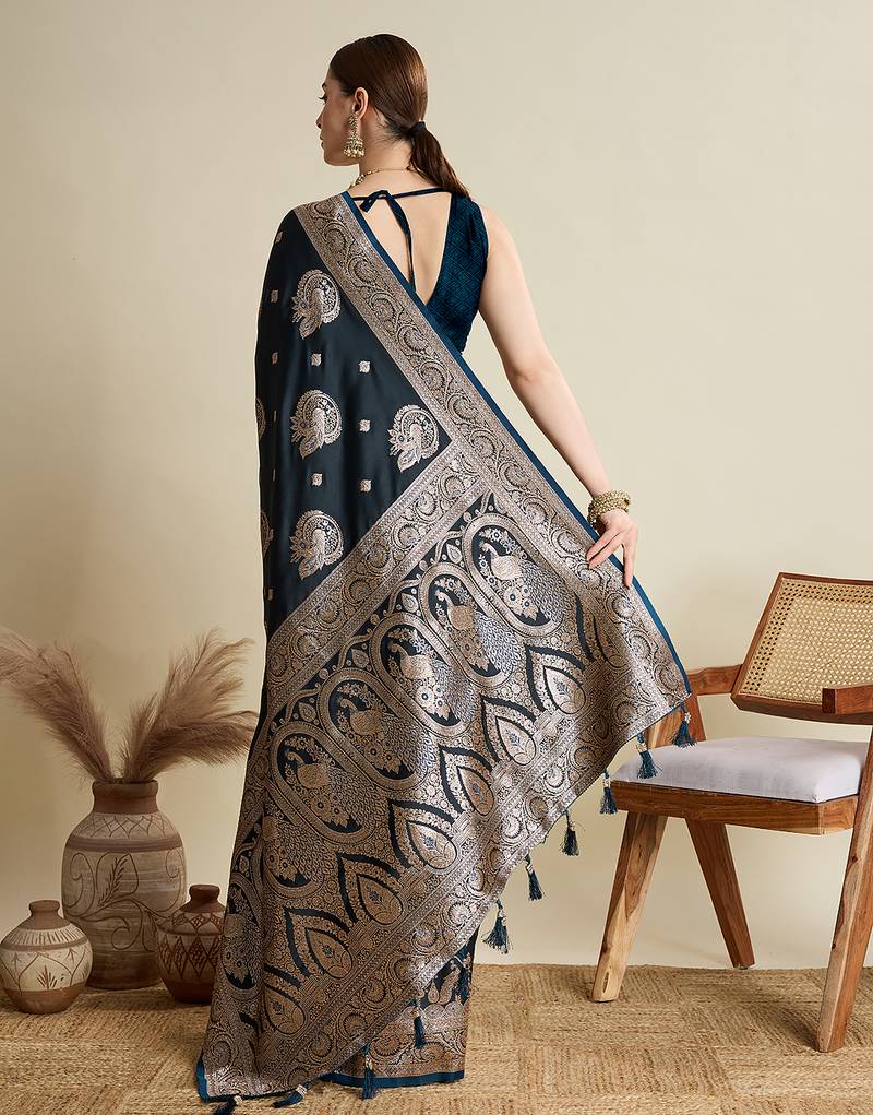 Navy blue woven embellished self design satin silk blend banarasi saree with blouse