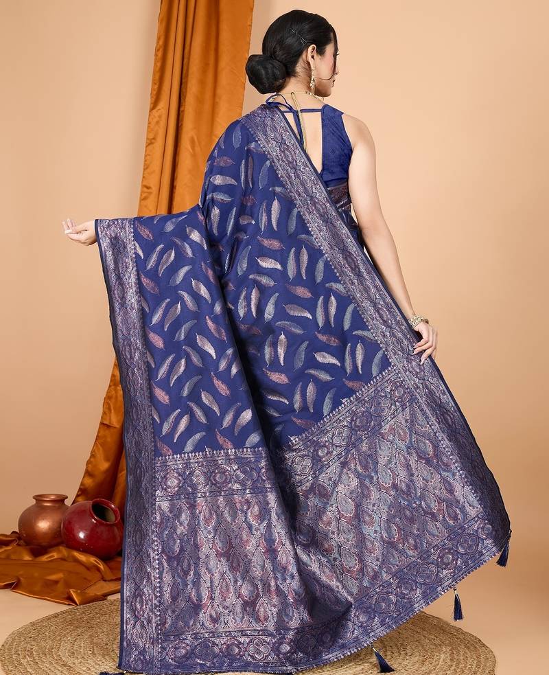 Navy blue woven self design embellished pure silk banarasi saree with blouse