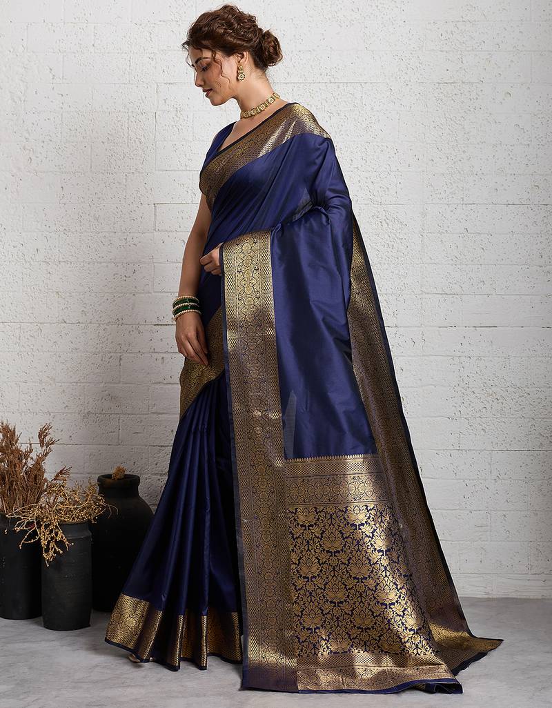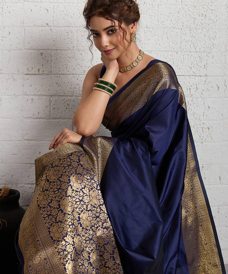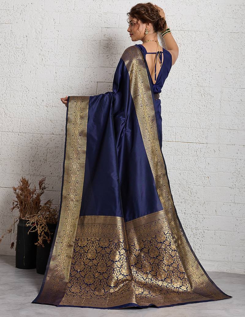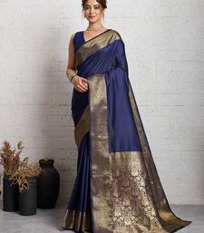 Navy blue woven, self design, embellished pure silk banarasi saree with blouse