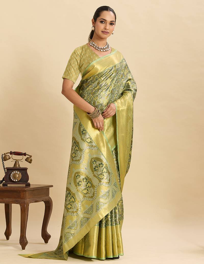 | Product Name | Olive Green Floral Print Woven Semi Silk Banarasi Saree With Blouse | |